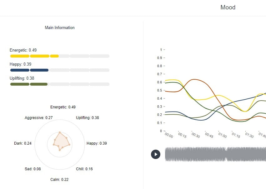Das System kann auch die auf YouTube verfügbare Musik und die von dir als MP3-Datei hochgeladene Musik analysieren. Cyanite erstellt ein visuelles Muster der Emotionen innerhalb von Songs und kann auch die verschiedenen Instrumente erkennen.